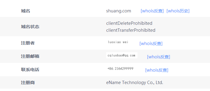目前,shuang.com已经完成交易并过户到买家名下,持有人显示为“luoxiao wei”,反查其注册邮箱发现其名下注册有一家“重庆罗宝科技有限公司”,而且名下还持有不少好米,如:“罗宝”luobao.com.cn/.cn、“我敢”wogan.cn、“网”wang.wang、“汗水”hanshui.com、“轮转”lunzhuan.com、“问理财”wenlicai.com等。
